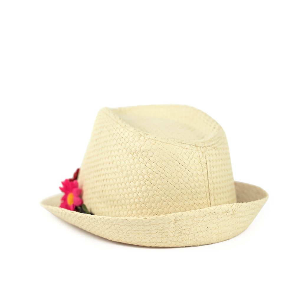 Letní klobouk typu trilby. Výrobek dekorovaný květinou. Provedený z přírodního materiálu. Velmi lehký, hezky se prezentuje na hlavě. Ideální doplněk na horké dny. Roztomilá pokrývka hlavy pro děti.