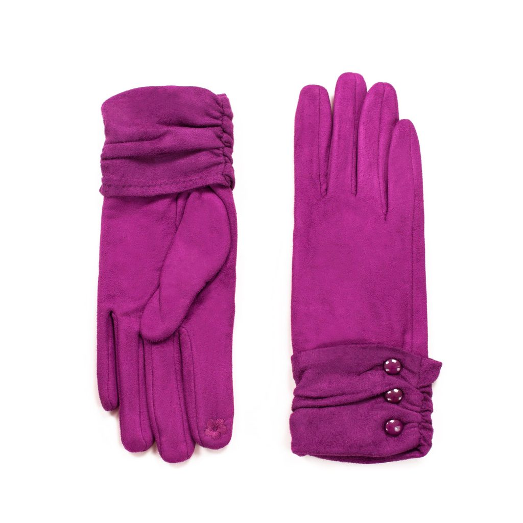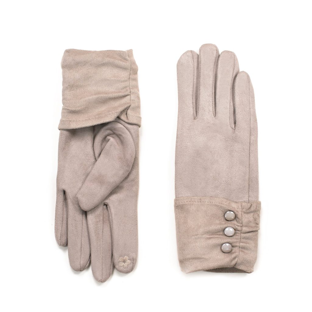 Vkusně zdobené elegantní rukavice. Provedené z materiálu příjemného na dotek, ideálně hřejí v chladných dnech. Pružné, pěkně se přizpůsobí dlaním. Můžete v nich manipulovat s telefonem. Výrobek dekorovaný knoflíčky. Zateplený výrobek. Tyto vkusné rukavice jsou výjimečně ženské a elegantní.