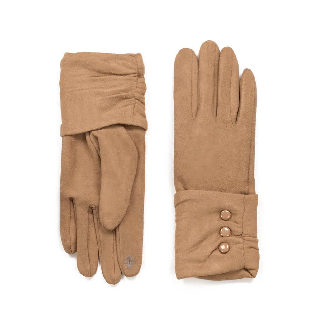 Vkusně zdobené elegantní rukavice. Provedené z materiálu příjemného na dotek, ideálně hřejí v chladných dnech. Pružné, pěkně se přizpůsobí dlaním. Můžete v nich manipulovat s telefonem. Výrobek dekorovaný knoflíčky. Zateplený výrobek. Tyto vkusné rukavice jsou výjimečně ženské a elegantní.