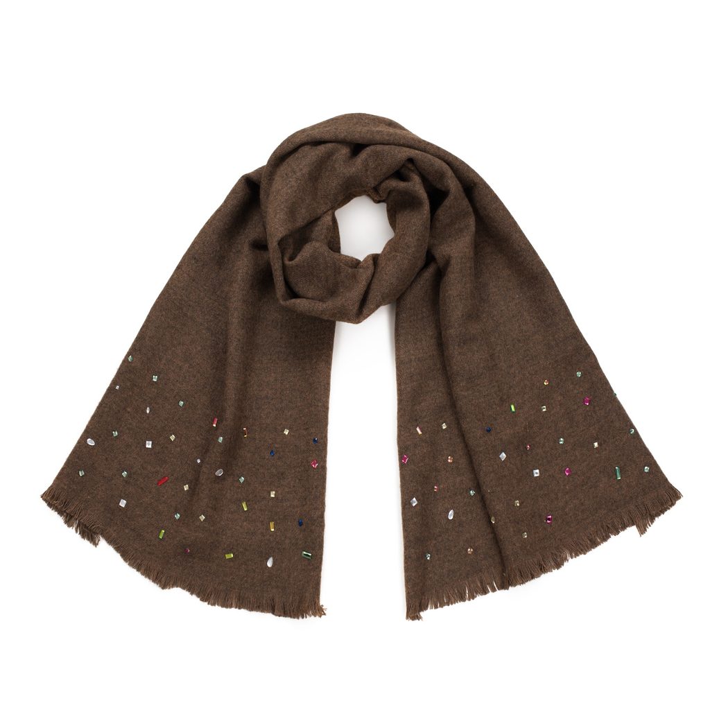 Hnědá šála zdobená barevnými kamínky