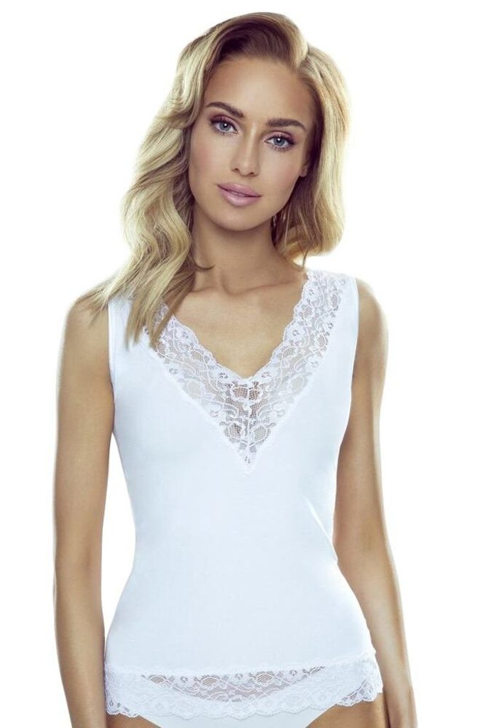 Elegantní krajkové tílko z přizpůsobivé viskózové tkaniny. Elegantní krajkové tílko z přizpůsobivé viskózové tkaniny. Materiál: 86% viskóza, 10% polyamid, 4% elastan