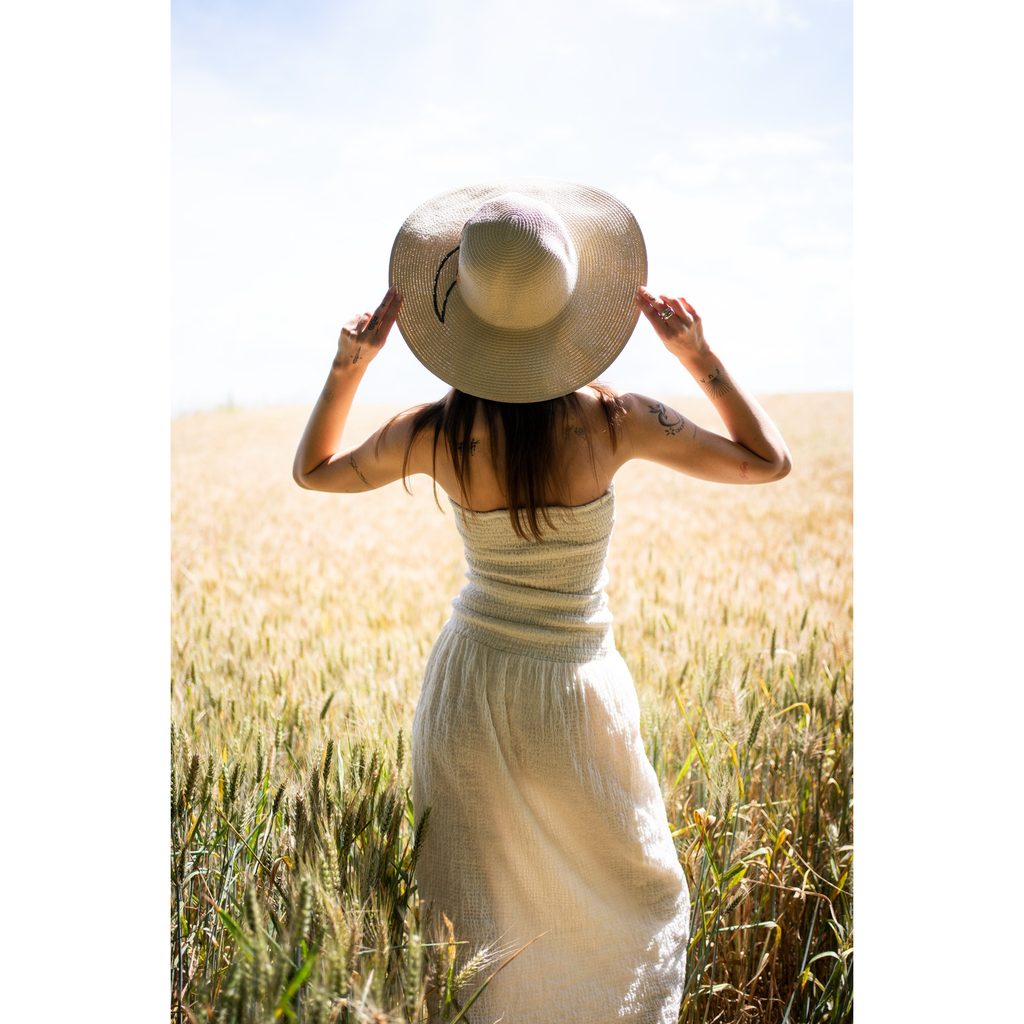 Letní klobouk se zdobeným lemem. Skvěle se hodí ke vzdušným letním šatům. Lehký a vzdušný, ideální na vedra. Stvořený pro milovnice boho a romantického stylu. Uvnitř se nacházejí pásky pro regulaci velikosti.