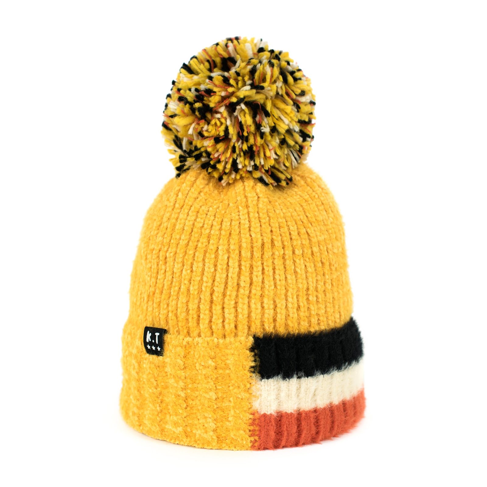 Dámská módní čepice s bambulí a perličkami žlutá Čepice