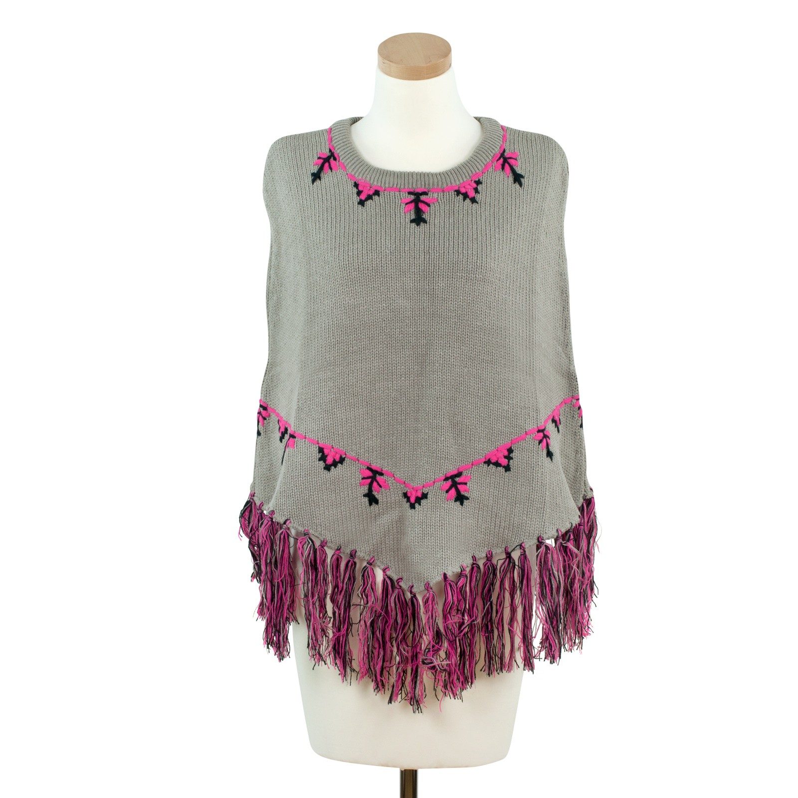 Módní pončo s třásněmi a vyšíváním šedorůžové