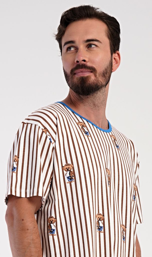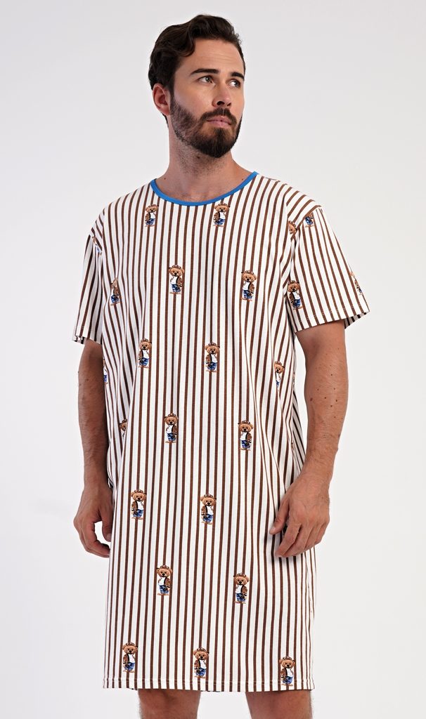 Pánská bavlněná noční košile s krátkým rukávem Bear. Proužkovaná pánská noční košile s kulatým výstřihem a délkou po kolena je potištěna medvídky. Použitý materiál s obsahem bavlny 100% je příjemný a poddajný na dotek.