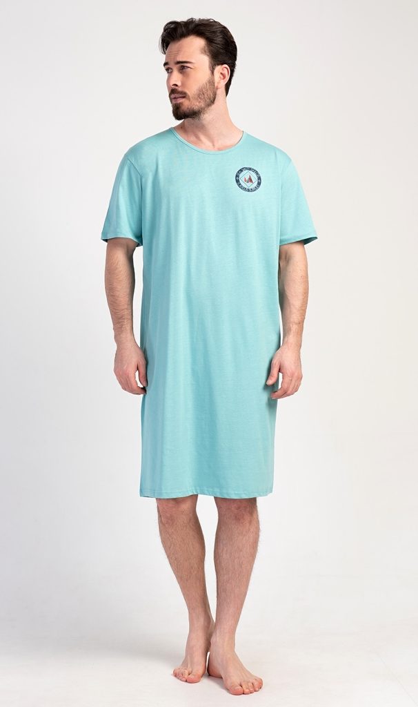 Pánská bavlněná noční košile s krátkým rukávem Sea. Jednobarevná pánská noční košile s kulatým výstřihem a délkou po kolena je zdobena decentním obrázkem s námořnickým motivem. Použitý materiál je příjemný a poddajný na dotek. Obsah bavlny je 100%.