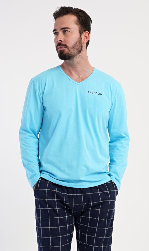 Pánské bavlněné pyžamo s dlouhým rukávem Daniel. Pánské pyžamo se skládá z trika s dlouhým rukávem a dlouhých kalhot. Triko s výstřihem do V zdobí na hrudi drobný nápis FREEDOM. Triko doplňují kárované kalhoty, které mají v pase gumu, šňůrku na stažení a praktické kapsy. Použitý materiál s obsahem bavlny 100% je příjemný a poddajný na dotek.