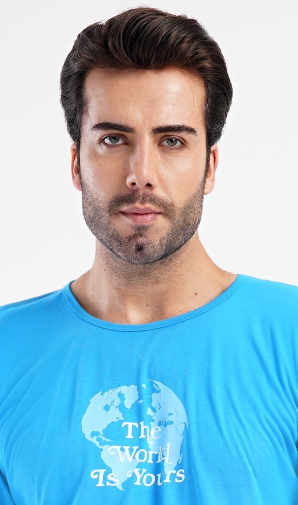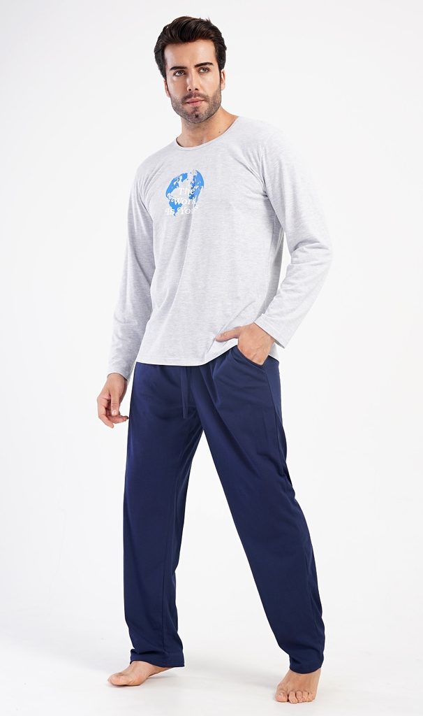Pánské dlouhé bavlněné pyžamo Matěj. Pánské pyžamo se skládá z trika s dlouhým rukávem a dlouhých kalhot. Triko s kulatým výstřihem je jednobarevné, zdobené na hrudi obrázkem zeměkoule a nápisem 'The world is yours'. Jednobarevné kalhoty mají v pase gumu, šňůrku na stažení a praktické kapsy. Použitý materiál je poddajný a příjemný na dotek. Obsah bavlny u kalhot a modrého trika je 100%, pouze u šedého trika 70%.