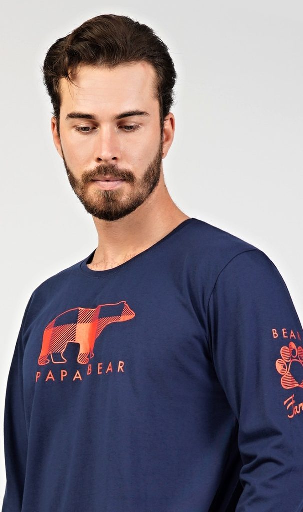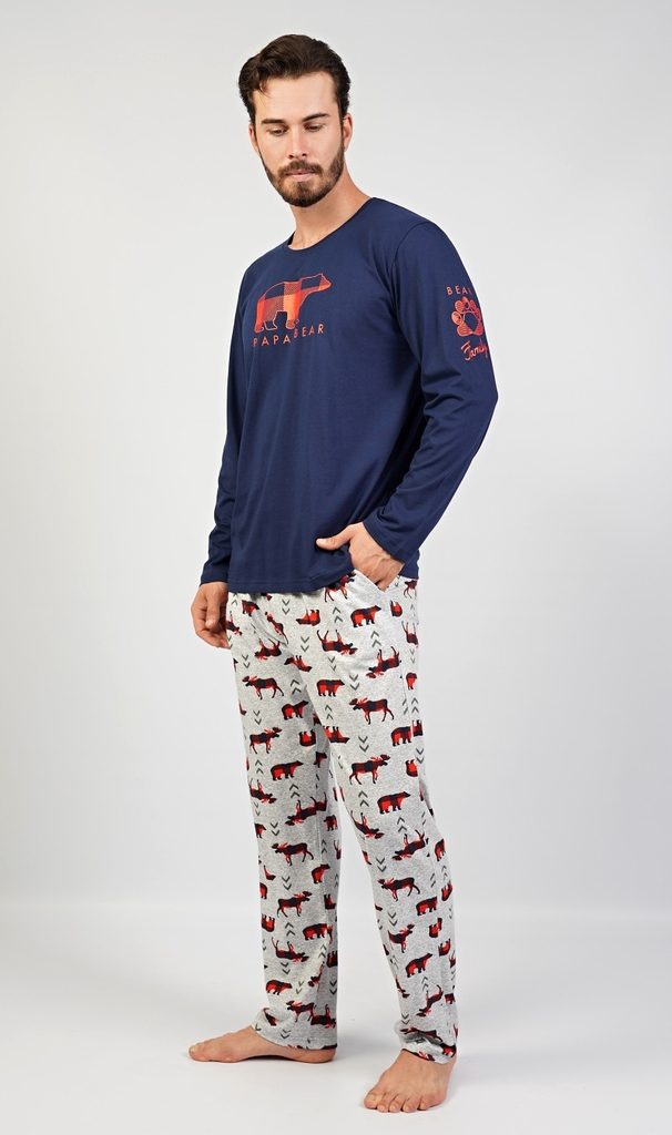 Pánské pyžamo dlouhé Papa bear. Pánské pyžamo se skládá z trika s dlouhým rukávem a dlouhých kalhot. Triko je jednobarevné s konturou medvěda a nápisem Papa bear. Kalhoty jsou světle šedé s celopotiskem medvědů a sobů. Kalhoty jsou do gumy a na stažení šňůrkou v pase. Oceníte i praktické kapsy. Použitý materiál je poddajný a příjemný na dotek.