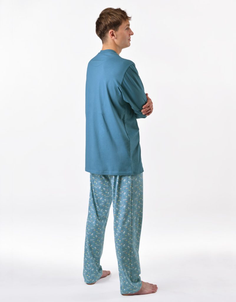Pánské klasické pyžamo volného střihu z jemného úpletu Vám poskytne pohodlí během spánku. Kalhoty s menším vzorem doplňuje triko s dlouhými rukávy a větším potiskem na hrudi.