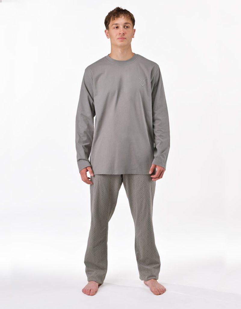 Pánské klasické pyžamo volného střihu z jemného úpletu Vám poskytne pohodlí během spánku. Kalhoty jsou potištěny drobným vzorem, triko s dlouhými rukávy zdobí menší potisk na hrudi.