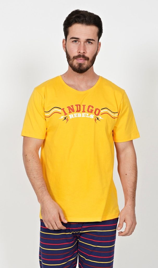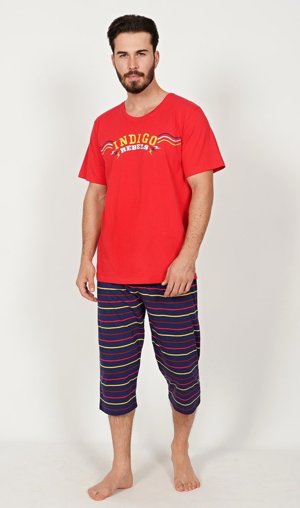 Pánské pyžamo kapri Indigo. Pánské pyžamo se skládá z trička s krátkým rukávem a tříčtvrtečních kalhot. Na tričku je nápis Indigo rebels, doplněný vlnovkou. Kalhoty jsou pruhované. Použitý materiál je jejmný a poddajný na dotek. Pyžamo je vhodné na denní nošení.