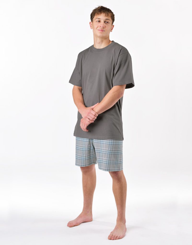 Pánské pyžamo volného střihu z jemného úpletu Vám poskytne pohodlí během spánku. Krátké kalhoty s oblíbeným potiskem káro doplňuje jednobarevné triko s krátkými rukávy.