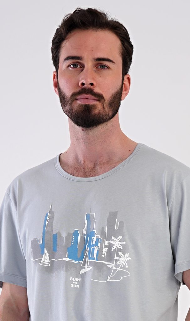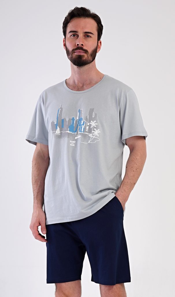 Pánské bavlněné šortkové pyžamo Bruno. Pánské pyžamo se skládá z trička s krátkým rukávem a krátkých šortkových kalhot. Jednobarevné tričko zdobí obrázek zátoky ve velkoměstě. Šortky mají praktické kapsy, v pase gumu a šňůrku na stáhnutí. Použitý materiál s podílem bavlny 100% je příjemný a poddaný na dotek. Pyžamo oceníte obzvlášť v horkých letních dnech.