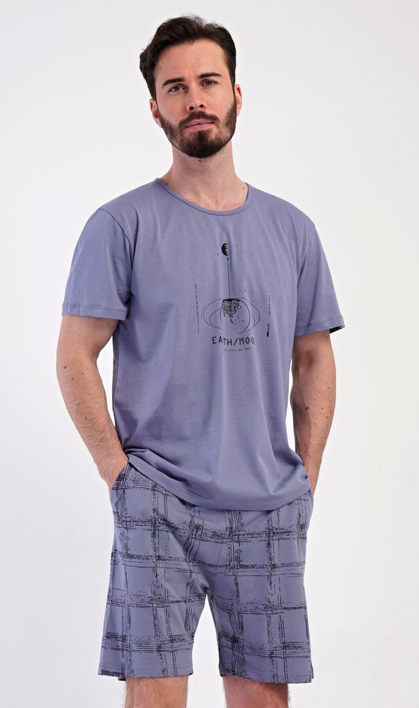 Pánské bavlněné šortkové pyžamo Earth. Pánské pyžamo se skládá z trička s krátkým rukávem a krátkých šortkových kalhot. Jednobarevné tričko má kulatý výstřih a zdobí ho na hrudi obrázek s motivem vesmíru. Tričko doplňují kárované šortky, které mají v pase gumu, šňůrku na stažení a praktické kapsy. Použitý materiál s obsahem bavlny 100% je příjemný a poddajný na dotek.