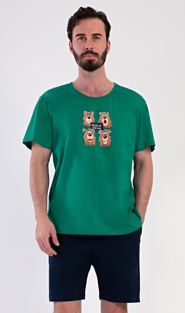 Pánské bavlněné šortkové pyžamo Méďa Happy. Pánské pyžamo se skládá z trička s krátkým rukávem a krátkých šortkových kalhot. Na jednobarevném tričku je obrázek medvěda, jehož výraz se mění v průběhu (pracovního) dne. Šortky mají praktické kapsy, v pase gumu a šňůrku na stáhnutí. Použitý materiál s podílem bavlny 100% je příjemný a poddaný na dotek. Pyžamo je vhodné i na denní nošení a oceníte ho obzvlášť v horkých letních dnech.