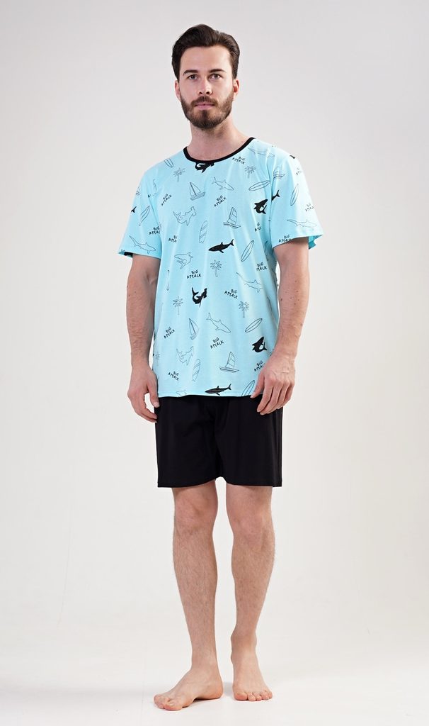 Pánské pyžamo šortky Oceán. Pánské pyžamo šortky se skládá z trika s krátkým rukávem a krátkých šortkových kalhot. Tričko je potištěno loďkami, žraloky , palmami a nápisem Big Attack. Takto potištěné tričko vhodně doplňují jednobarevné šortky. Použitý materiál je poddajný a příjem ný na dotek. Pyžamo je vhodné na denní nošení.