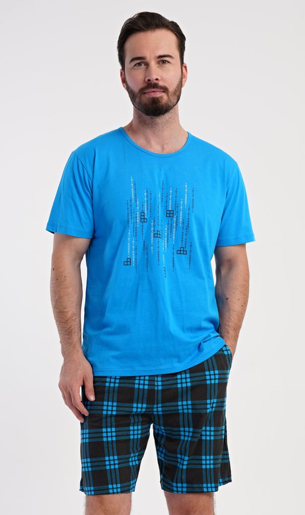 Pánské bavlněné šortkové pyžamo Tetris game. Pánské pyžamo se skládá z trička s krátkým rukávem a krátkých šortkových kalhot. Tričko s kulatým výstřihem zdobí na hrudi obrázek hry Tetris. Tričko doplňují kárované šortky, které mají v pase gumu, šňůrku na stažení a praktické kapsy. Použitý materiál s obsahem bavlny 100% je příjemný a poddajný na dotek.