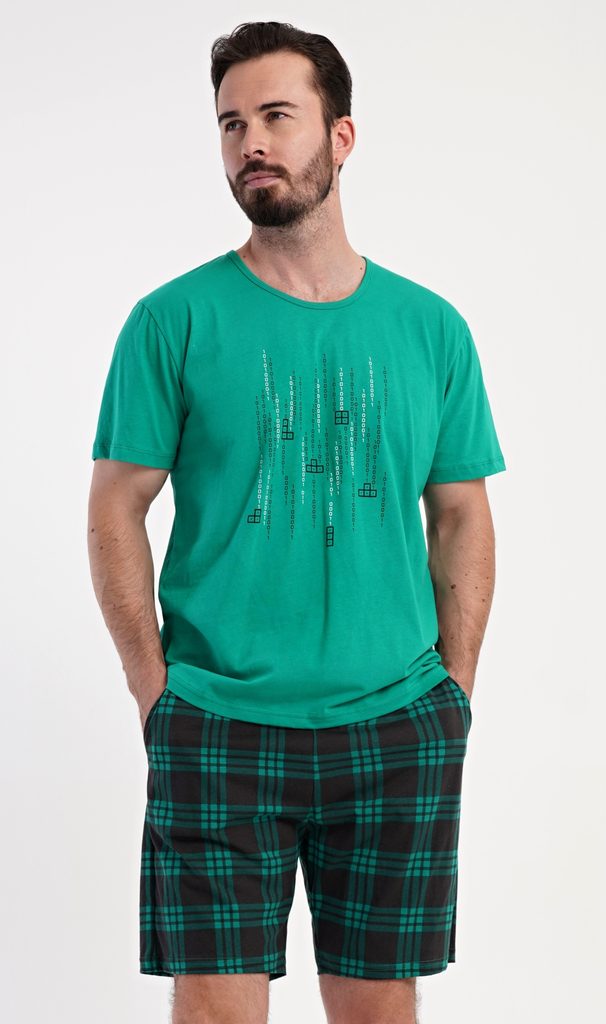 Pánské bavlněné šortkové pyžamo Tetris game. Pánské pyžamo se skládá z trička s krátkým rukávem a krátkých šortkových kalhot. Tričko s kulatým výstřihem zdobí na hrudi obrázek hry Tetris. Tričko doplňují kárované šortky, které mají v pase gumu, šňůrku na stažení a praktické kapsy. Použitý materiál s obsahem bavlny 100% je příjemný a poddajný na dotek.