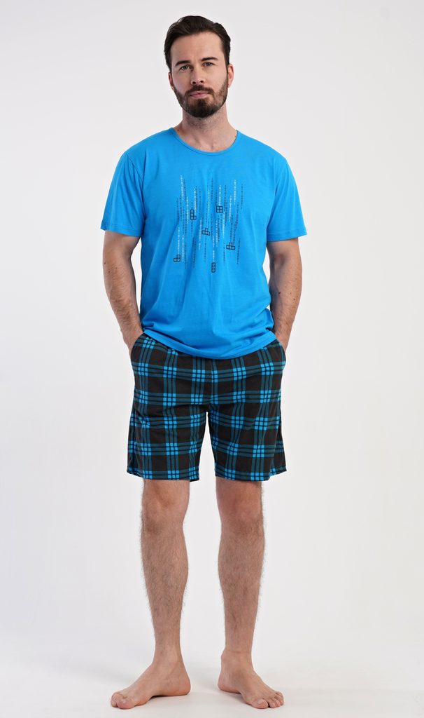 Pánské bavlněné šortkové pyžamo Tetris. Pánské pyžamo se skládá z trička s krátkým rukávem a krátkých šortkových kalhot. Tričko s kulatým výstřihem zdobí na hrudi obrázek hry Tetris. Tričko doplňují kárované šortky, které mají v pase gumu, šňůrku na stažení a praktické kapsy. Použitý materiál s obsahem bavlny 100% je příjemný a poddajný na dotek.
