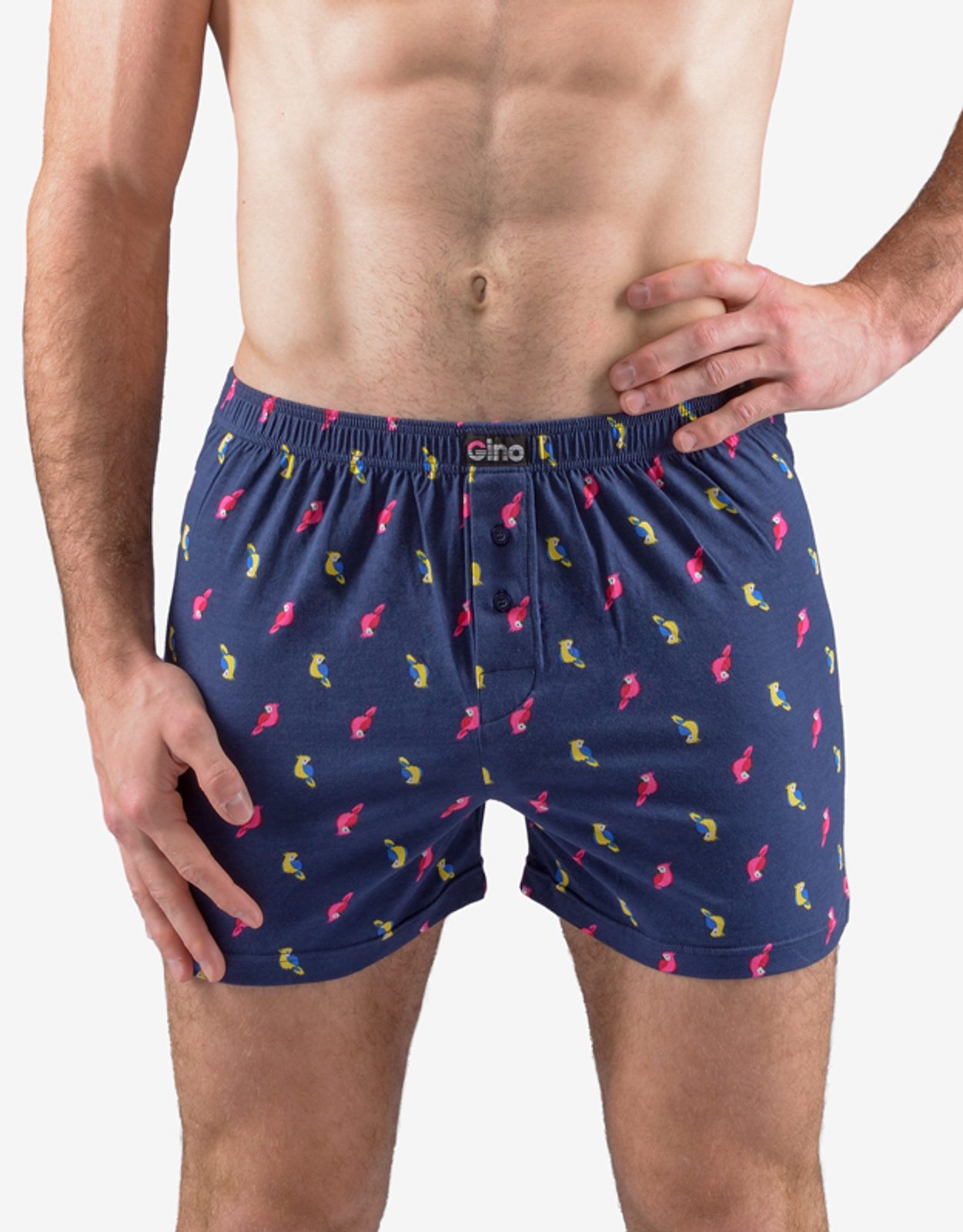 Volné trenky, pánské šité prádlo. V pasovém kraji je zašitá širší pruženka. Nohavičky jsou začištěné podehnutím. Na předním díle je vypracovaný rozparek na 2 knoflíky. Zadní díl je členěný středovým švem. Trenky jsou potištěné výraznějším vzorem.