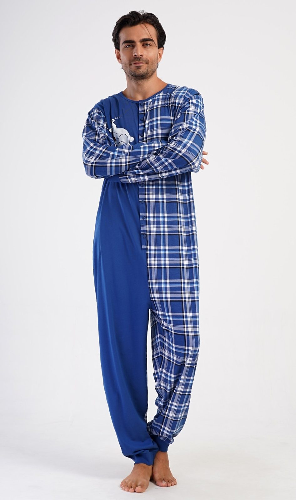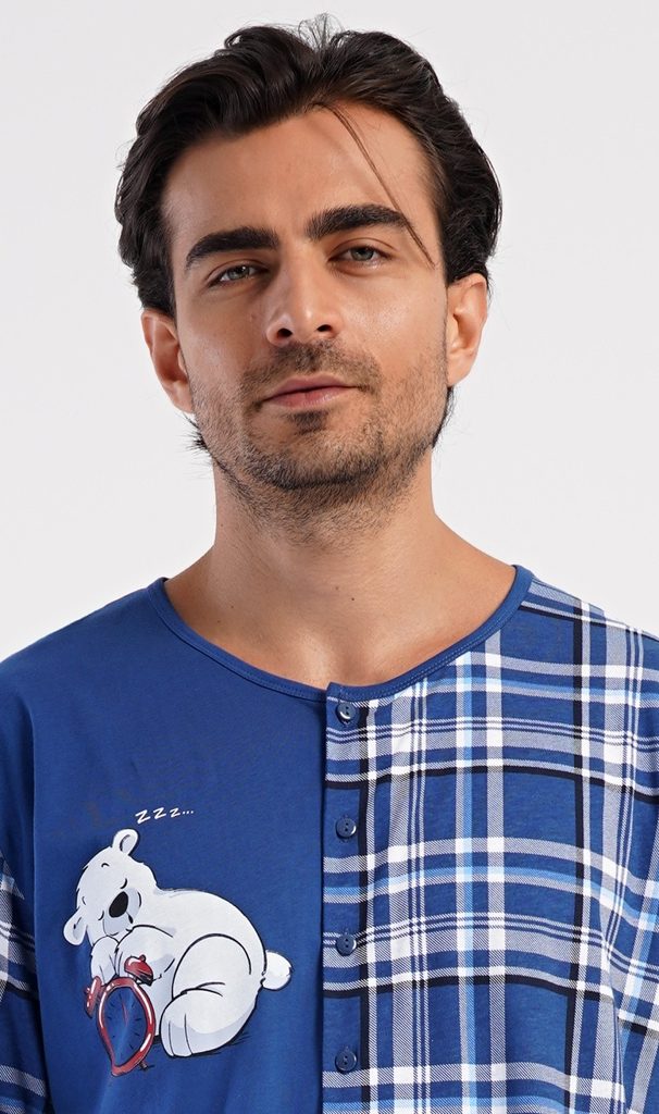 Pánský bavlněný overal Méďa Ospalec. Celopropínací overal zaručuje pohodlné spaní, rukávy a nohavice jsou zakončeny elastickým lemem. Overal se pohledově skládá ze dvou polovin. Jednobarevné, kterou zdobí obrázek ledního medvěda, a kárované, z tohoto materiálu je ušitý i zadní díl a rukávy. Použitý bavlněný materiál je příjemný a poddajný na dotek.