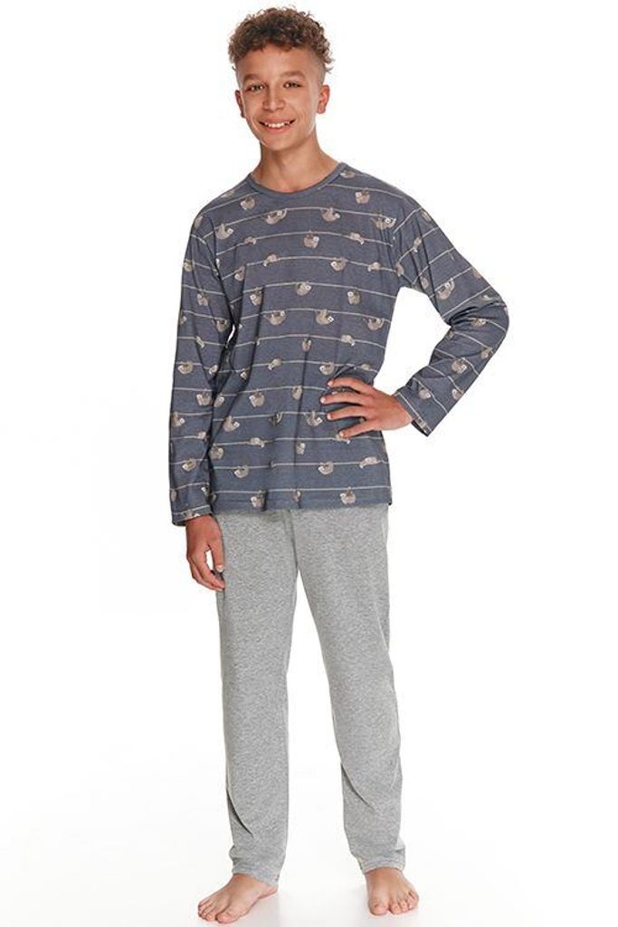 Pyžamo pro starší kluky má pohodlný střih, je šedé a má krásný vzor s obrázky malých lenochodů. Pyžamo pro starší kluky má pohodlný střih, je šedé a má krásný vzor s obrázky malých lenochodů. Materiál: 100% bavlna horní díl; 80% bavlna, 20% polyester dolní díl