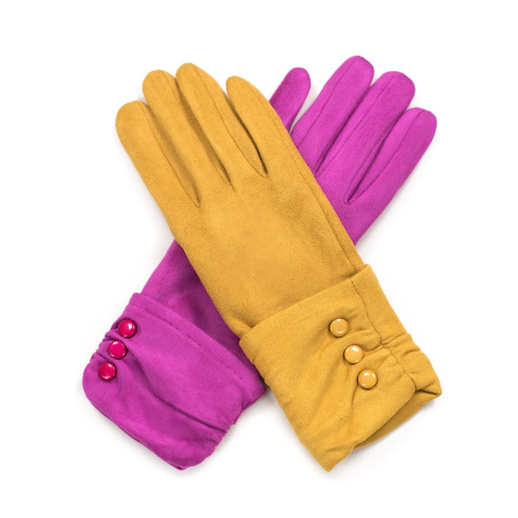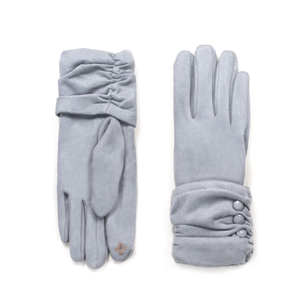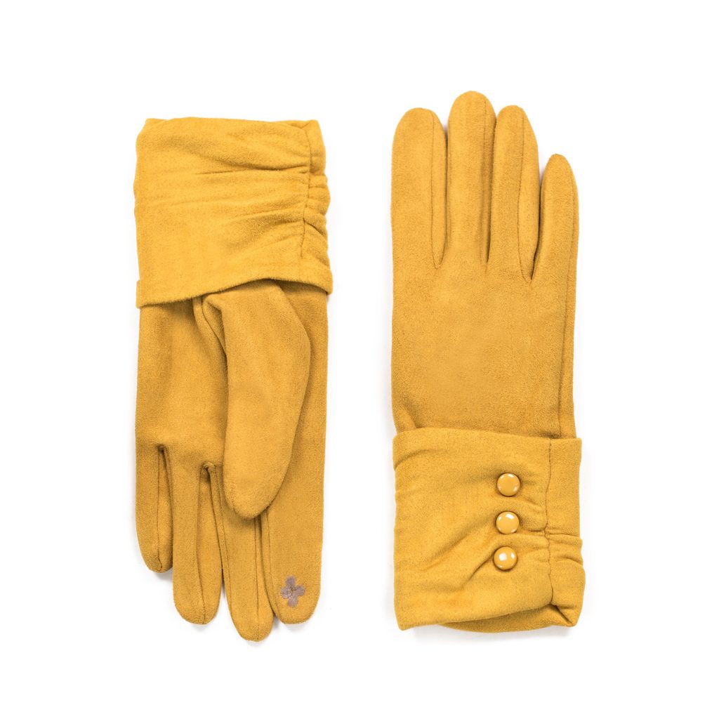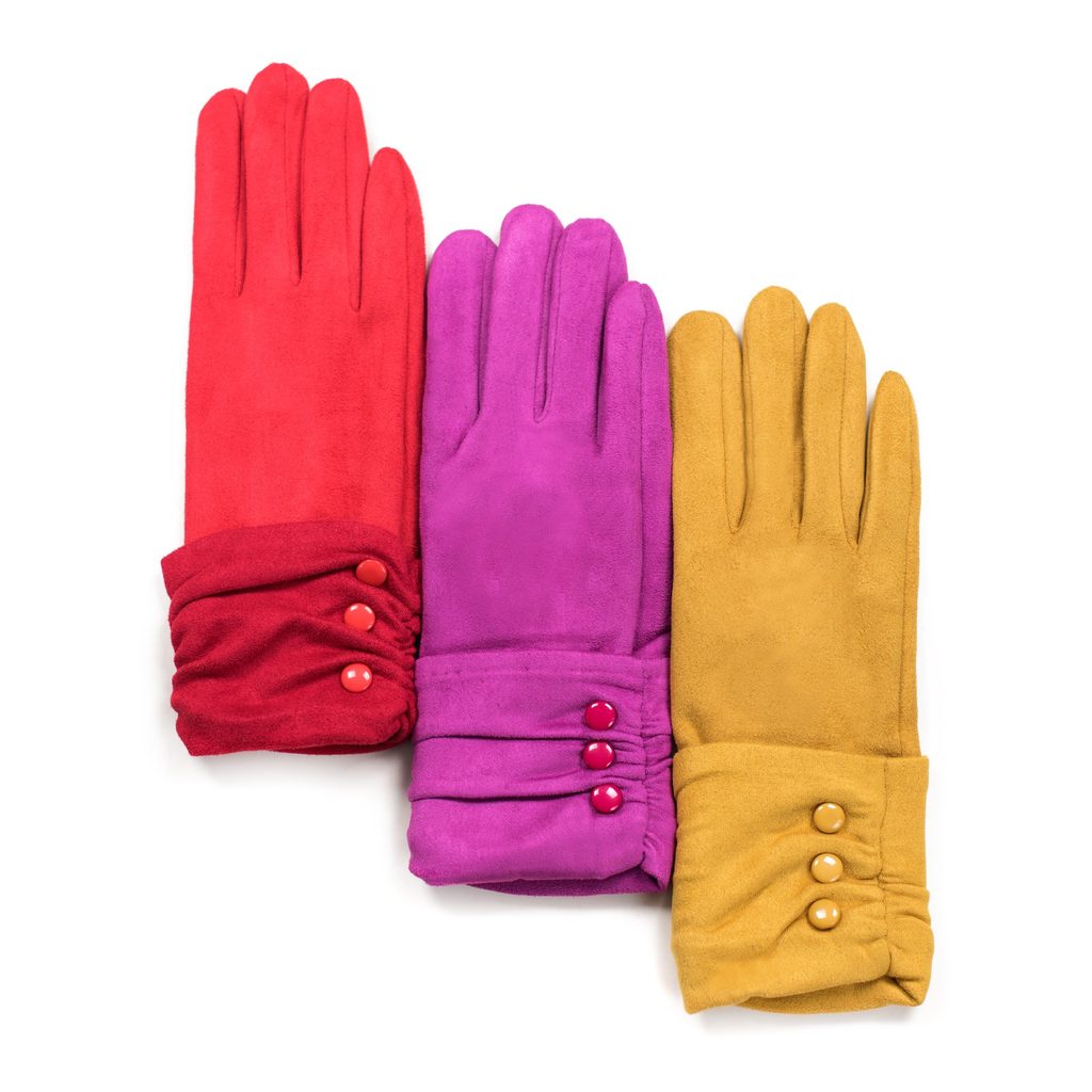 Vkusně zdobené elegantní rukavice. Provedené z materiálu příjemného na dotek, ideálně hřejí v chladných dnech. Pružné, pěkně se přizpůsobí dlaním. Můžete v nich manipulovat s telefonem. Výrobek dekorovaný knoflíčky. Zateplený výrobek. Tyto vkusné rukavice jsou výjimečně ženské a elegantní.