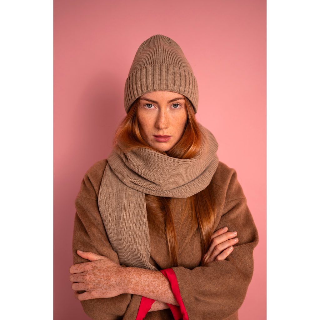 Zimní sada: čepice a šála. Čepice dobře přiléhá k hlavě. Klasický střih se bude hodit k mnoha stylizacím. Unisex.