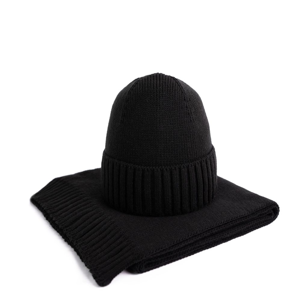 Zimní sada: čepice a šála. Čepice dobře přiléhá k hlavě. Klasický střih se bude hodit k mnoha stylizacím. Unisex.