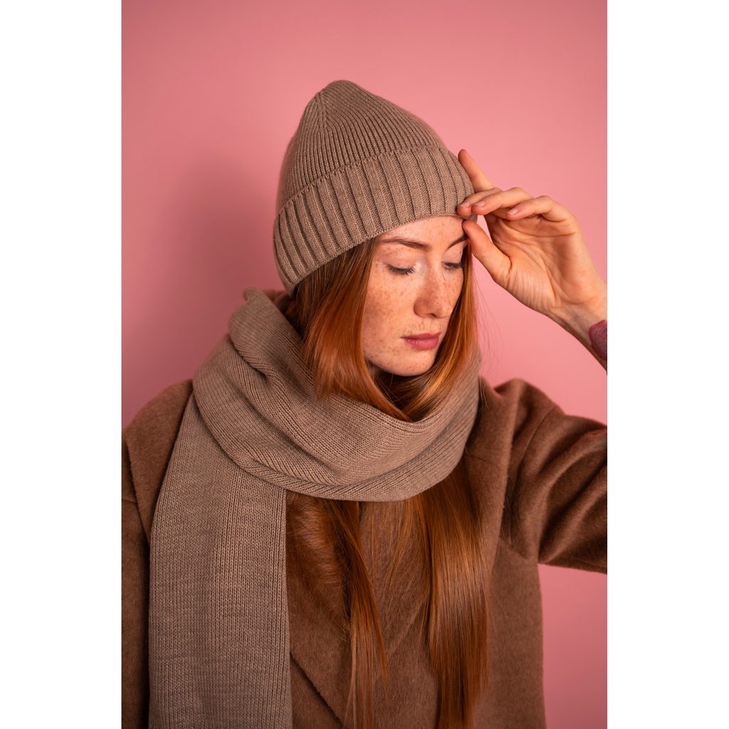 Zimní sada: čepice a šála. Čepice dobře přiléhá k hlavě. Klasický střih se bude hodit k mnoha stylizacím. Unisex.