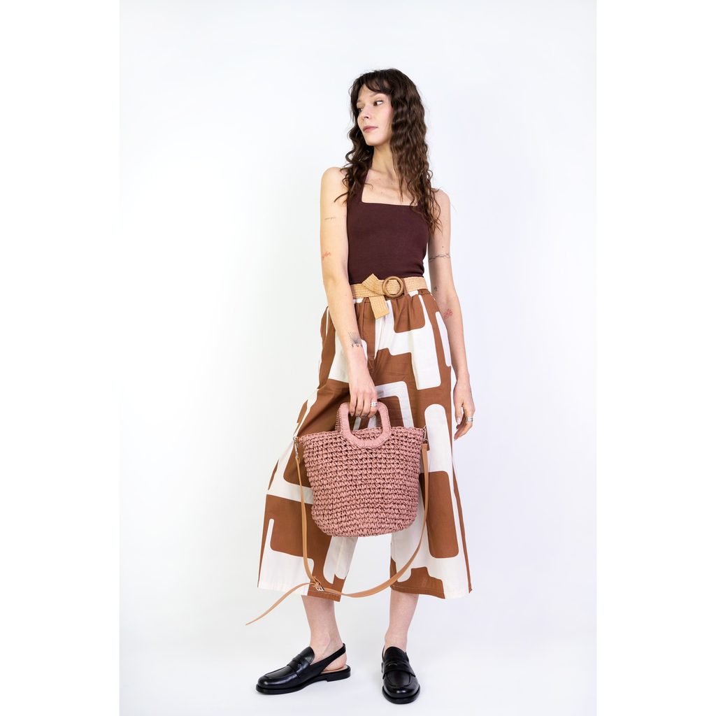Taška z impregnovaného papíru. Podšívka uvnitř. Dva páry uší - do ruky a na rameno. Má odepínatelný pásek. Tato taška se bude hodit k mnoha stylizacím: zároveň k neformálním, jak i elegantnějším.