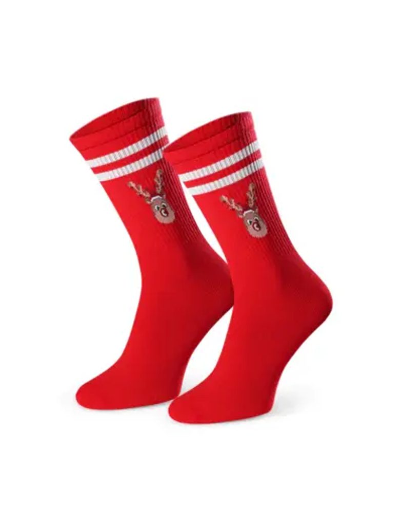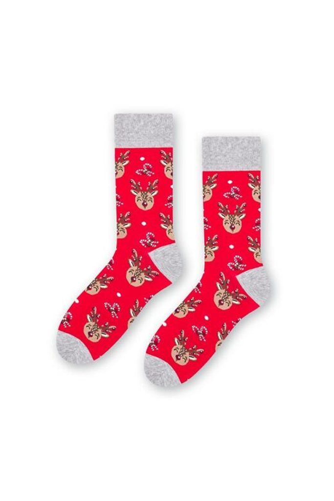 Červené ponožky se sobem krásně doladí sváteční atmosféru. Jsou s obrázkem vánočního soba.