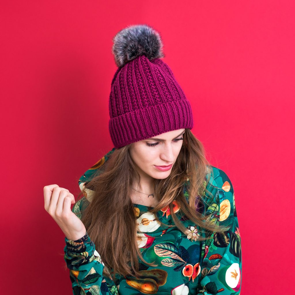 Zimní čepice s bambulí. Provedená z nekousavého materiálu. Bambule provedená z umělé kožešiny. Spodní část na zahnutí. Vejdou se do ní sepnuté vlasy. Velmi teplá. Hodí se zároveň k neformálním i elegantním stylizacím.